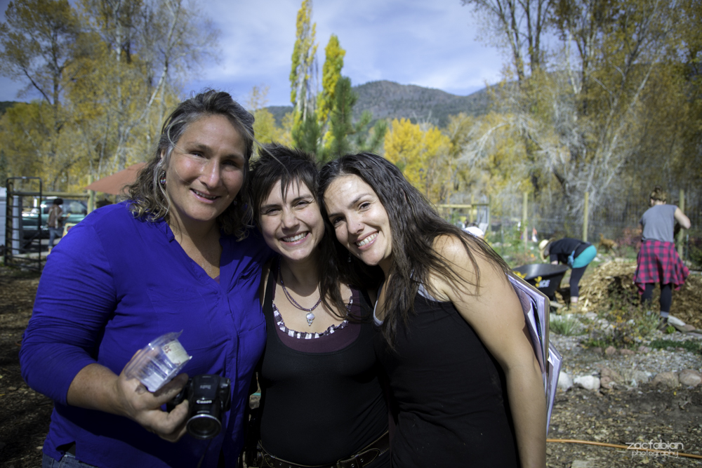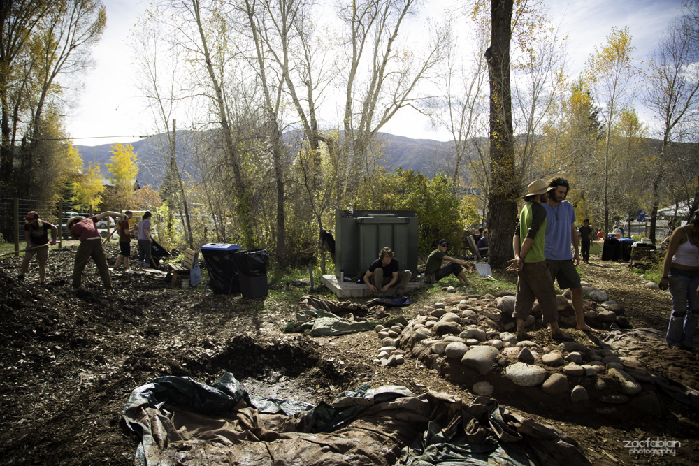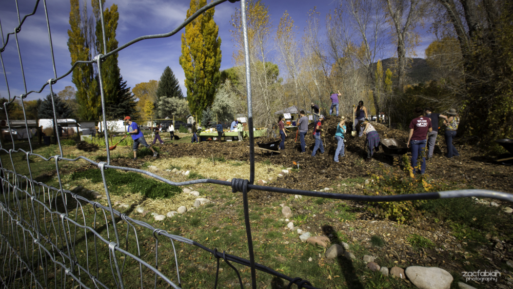 Our Action Day for Aspen, Colorado, took place at the Basalt Food Garden on Saturday, October 18th, 2014. The Permaculture Action Team and the Polish Ambassador joined the community to improve and expand the diversity of the young food forest. We arrived to dozens of volunteers and community members diligently at work spreading wood chips between garden beds, building a cob bench, and planting perennial, medicinal, and edible plants.